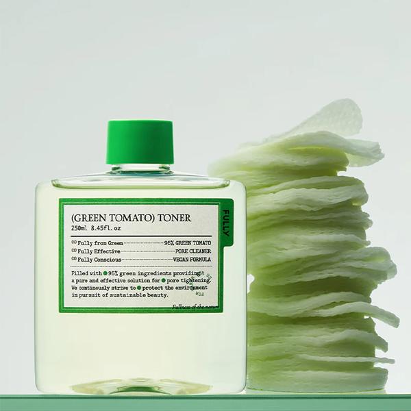 The FULLY Green Tomato Toner 250ml is a vegan, fragrance-free facial toner designed to hydrate, brighten, and refine skin texture. With a high concentration of 95% green tomato extract, this lightweight, watery toner targets enlarged pores while improving skin elasticity and radiance. Suitable for all skin types, including sensitive skin, it delivers gentle yet effective care, leaving the skin refreshed, calm, and balanced. Its plant-based water base ensures deep, non-greasy hydration while maximizing the potency of active ingredients.