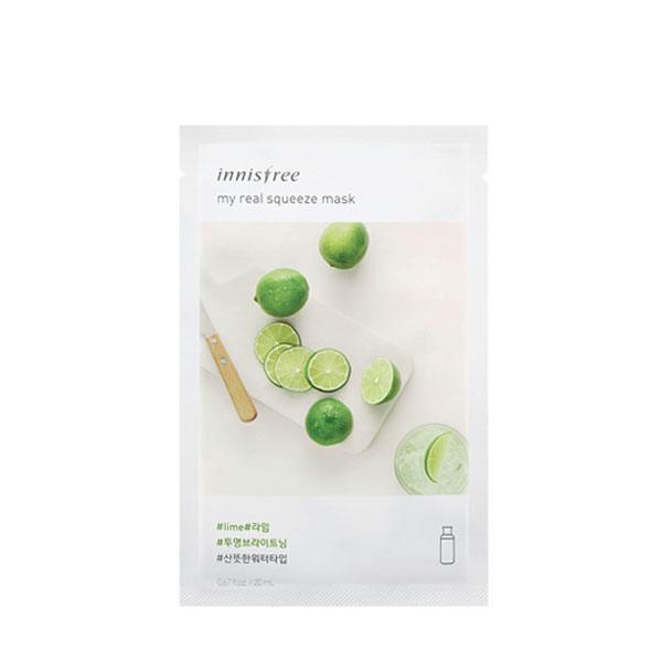 The Innisfree My Real Squeeze Mask (Lime) is a refreshing and brightening sheet mask that delivers hydration and radiance to tired, dull skin. Infused with fresh lime extract and niacinamide, this mask helps revitalize the complexion while soothing and calming the skin. Its lightweight, water-type essence absorbs quickly, leaving skin soft, smooth, and glowing. Made with a triple-layered, 100% eucalyptus-derived cellulose sheet, it adheres snugly to your face for optimal nutrient absorption, making it ideal for all skin types, including sensitive skin. The ingredients are extracted using the cold brew squeeze method, preserving their freshness and potency for maximum skincare benefits.